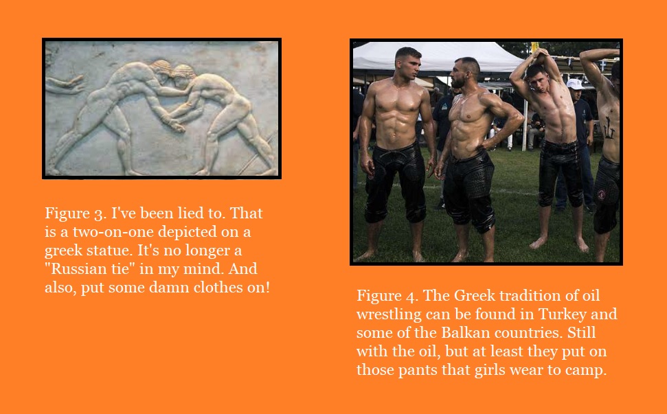 The Greeks set the singlet back a thousand years. Their singlet wasn’t made of fabric or animal skin or anything like that; their singlet was made of oil. Transparent slippery oil. That was it. They still do that, sort of. (Figs. 3 & 4).